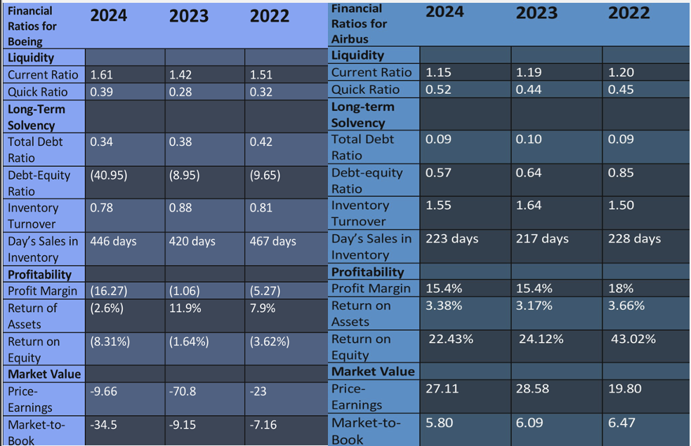 A semester long report was compiled by Alex Bodeker and 5 of his peers regarding the state of Boeing Company's operations. Alex focused on the financial statements and ratios section. With the comparative tables of Boeing and Airbus linked below, it's shows he can simplify a company's long financial statements into simple insights that are used to make informed decisions.